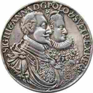 Rzadki talar medalowy z roku 1595 Zygmunta III Wazy wraz z małżonką Anną upamiętniający ich ślub, który odbył się w 1592 roku. UWAGA! Oryginał też był odlewany - co za tym idzie, kopia jest bardzo realistyczna.