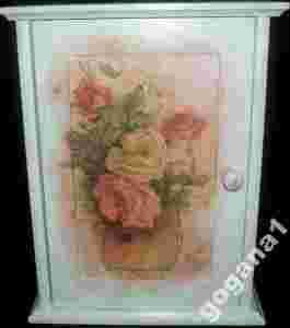 przedmiotem aukcji jest drewniana skrzynka (szafka, domek) na klucze, misternie ręcznie zdobiona techniką decoupage i farbami akrylowymi, pięknym RÓŻANYM motywem