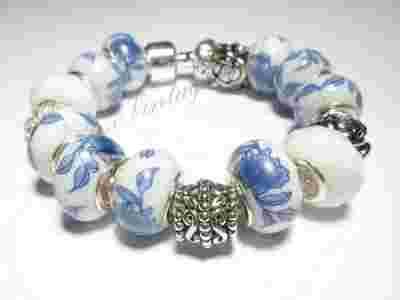 Porcelanowa bransoletka modułowa, błękit, kwiaty