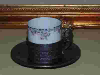 PORCELANOWA FILIŻANKA W CYNOWYM KOSZYCZKU