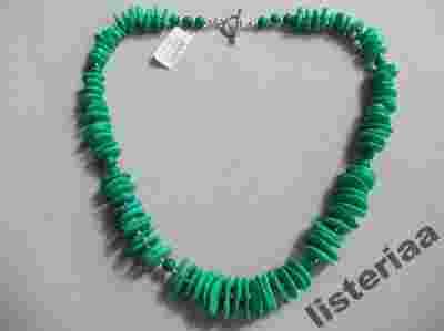 Sprzedaję efektowny naszyjnik z howlitów w kształcie dyżych dysków z dodatkiem małych zielonych malachitowych kulek. Kolory kamieni są wyraziste, howlit ma ładna turkusowo - zieloną barwę i nieregularne kształty. Naszyjnik zadowoli osoby szukające nietypowej biżuterii, gdyz dzięki zestawionym ze soba kamieni jest wyjątkowo oryginalny.