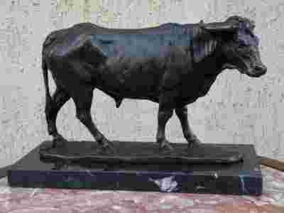 POSTAWNY BYK NA MARMURZE Z BRĄZU. SYGNOWANY