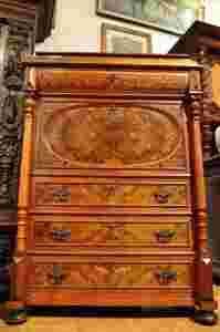Potężną Oryginalną Sekreterę pochodząca z końca XIXw. O pięknym wzorzystym fornirze pokrywającym całą sekreterę jak i wnętrze mebla. Całość charakteryzują niesamowite zdobienia. Jest meblem bardzo praktycznym i dekoracyjnym. Proszę zwrócić uwagę na wzór w formie korzenia, na który ułożona starannie została okleina. Dodatkowo wewnątrz zdobiona jest intarsją