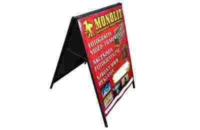 Używany potykacz reklamowy. Potykacz jest duży i ciężki, waga około 10kg, wykonany z profili stalowych. Aluminiowe, czy plastikowe konstrukcje stawiane na zewnątrz, niestety już na lekkim wietrze "fruwają". Potykacz jest dwustronny, reklama naklejona jest na blasze cynkowanej. Stan zewnętrzny bardzo dobry, blacha jest w kilku miejscach bardzo delikatnie podgięta (oczywiście jest teraz wyprostowana) ktoś się o niego dosłownie potknął, ale myślę że i tak robiąc nową reklamę będzie ona wymieniona na nową można tez użyć PCV. Jest to zresztą w tej chwili praktycznie nie niewidoczne. Najważniejsza jest mocna i stabilna rama. Mocowanie blach do ramy jest na nity, ja cześć wymieniłem na śrubki. Potykacza używałem około 1 roku.