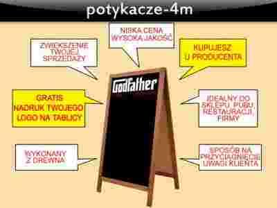 Przedmiotem aukcji jest potykacz reklamowy dwustronny, wykonany z drewna, w kolorze brązowym z jednostronnym nadrukiem bezpośrednio na płycie według dostarczonego projektu. Zabezpieczony przed rozłożeniem łańcuszkiem. Powierzchnia do pisania wykonana jest z płyty HDF. Jako gratis wykonywany jest wysokiej jakości nadruk na jednej stronie potykacza, bezpośrednio na powierzchni do pisania w wymiarach maksymalnych 53x20cm w poziomie lub 13x80cm w pionie do wyboru.