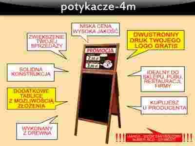 Potykacz posiada dodatkowo dwie górne tablice, które przykręcone są na zawiasach - umożliwiają one zastosowanie własnych wkładek reklamowych o wymiarach: 53,5 x 42 cm. Po rozłożeniu górnych tablic potykacz jest łatwiejszych do schowania i zajmuje mniej miejsca. Dzięki zastosowaniu górnej tablicy, treści umieszczone na niej znajdują się dokładnie na linii wzroku Państwa potencjalnych klientów. Powierzchnie do pisania wykonane są z płyt HDF. Potykacz nadaje się do zastosowania przy restauracjach, pubach, barach, hotelach itp.