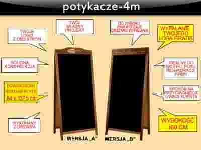 Przedmiotem aukcji jest potykacz reklamowy dwustronny, wykonany z drewna, lakierowany w kolorze brązowym oraz DARMOWE WYPALANIE (z obu stron) według dostarczonego projektu. Zabezpieczony przed rozłożeniem łańcuszkiem. Powierzchnia do pisania wykonana jest z płyty HDF. Dzięki powiększonemu rozmiarowi potykacza (aż 160 cm wysokości!) treści umieszczone na nim znajdują się dokładnie na linii wzroku Państwa potencjalnych klientów.