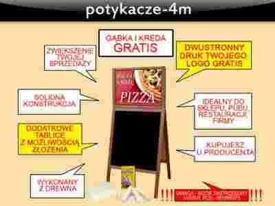 Potykacz posiada dodatkowo dwie górne tablice, które przkręcone są na zawiasach - umożliwiają one zastosowanie własnych wkładek reklamowych o wymiarach: 53,5 x 42 cm. Po rozłożeniu górnych tablic potykacz jest łatwiejszych do schowania i zajmuje mniej miejsca. Dzięki zastosowaniu górnej tablicy, treści umieszczone na niej znajdują się dokładnie na linii wzroku Państwa potencjalnych klientów. Powierzchnie do pisania wykonane są z płyt HDF. Potykacz nadaje się do zastosowania przy restauracjach, pubach, barach, hotelach itp.