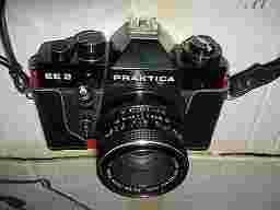 Praktica EE2 (Pentacon) .Aparat z elektrycznym pomiarem światła. Przy regulacji przysłony z prawej strony w obiektywie widać odpowiednik ustawianego czasu. Zasilany baterią 4,5V- paluszek- jest w aparacie nie wylana , ale już nie działa (stara). Naciąg reporterski. Posiada obiektyw Carl Zeiss Jena- Pancolar Elektrict 1,8/50, na gwint m 42. Przełącznik w obiektywie na ustawienia ręczne i automat. Aparat razem z oryginalnym futerałem.