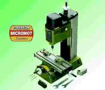 Frezarka MF 70 renomowanej firmy Proxxon to doskonałej klasy narzędzie do obróbki precyzyjnej, do pracy z najmniejszymi frezami. Posiada stabilną podstawę, pionową prowadnicę oraz stół krzyżowy wykonany z ciśnieniowego odlewu aluminium. Frezarka wyróżnia się sztywną konstrukcją, dostosowana do pracy we wszystkich osiach. Wysięgnik z silnikiem o specjalnej konstrukcji – 24-polowy, wyważony i precyzyjny idealny do prac bez drgań przy wysokich obrotach. Dzięki temu można zastosować frezy o bardzo małych średnicach. Mocowanie narzędzi poprzez system zacisków MICROMOT – trójszczękowe, 6-krotnie szlifowane, precyzyjne zaciski (w komplecie jest 6 szt o średnicach: 1,0 – 1,5 - 2,0 – 2,4 – 3,0 – 3,2mm). Dołączony stół krzyżowy o trzech prowadnicach. Przestawna podziałka umożliwia pozycjonowanie sań poprzecznych. Wszystkie pokrętła ręczne ze skalą od 0 (1U=1mm, podziałka 0,05mm).