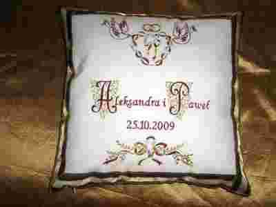 Na poduszce wyhaftowane są imiona Państwa Młodych i data ślubu,oraz ozdobny ornament.Haft wykonany jest maszynowo specjalnymi nićmi.