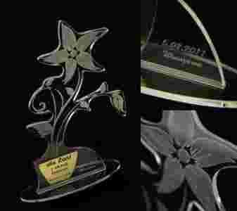 - Materiał, z którego wykonana jest statuetka to przeźroczysty akryl o grubości 4 mm grawerowany laserowo