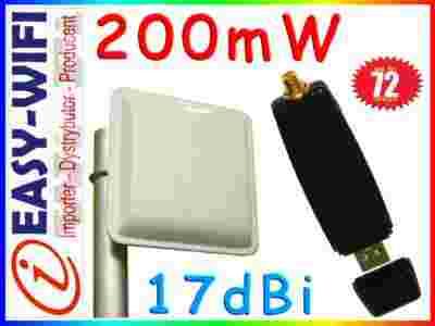 Oferowany przez nas zestaw składa się z profesjonalnej anteny panelowej 17dbi oraz jednej z najmocniejszych kart USB 2.0 dostępnych na rynku - 200mW - 23dBm - rozwiązanie szczególnie polecane do laptopów niemniej może być używane z powodzeniem w komputerach stacjonarnych - dzięki dużej mocy karty oraz silnej antenie zestaw pozwala na realizację połączeń przez kilka drzew lub krzaki - gwarantując przy tym stabilność i odpowiednią szybkość połączenia