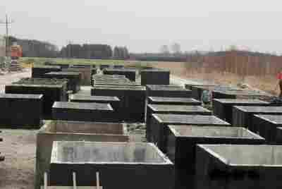 Zbiornik wykonany jest z betonu własnej produkcji klasy B-25, z dodatkiem płynów wodoszczelnych, zbrojony kratką zbrojeniową ze stali żebrowanej i zabezpieczony z zewnątrz izolbetem (masą asfaltowo-kauczukową). Zbiorniki podczas zalewania betonem są odpowiednio wibrowane celem zagęszczenia betonu co wzmacnia jego wytrzymałość i szczelność.