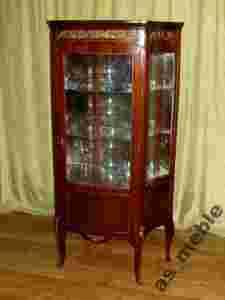 Mebelek jest wykonany współcześnie na stary styl. Cechuje go wyrafinowany kształt , oraz zdobienia mosiężne w postaci dekorów i okuć. Witrynka posiada dwie szklane półki oraz plecy i dół lustrzane.