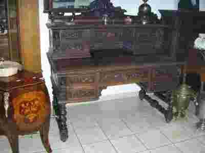 WITAM Państwa.Mam zaszczyt zaoferowac Państwu śliczne zabytkowe biurko.Przywieżione zostało z Francji i tam zrobuione w drugiej połowie XIX wieku.Wykonane z masywu dębowego koloru ciemny brąz.Posiada dziesięć szuflad ze sprawnymi oryginalnymi zamkami i kluczami.Ewenementem są uchwyty przy szfladach wykonane z masywu dębowego przedsawiające maszkarony mające przynosić szczęście.Głowy elfów zdobią też cztery narożniki biurka.Zapraszam do zakupu tego wyjątkowo pięknego biurka.Ponieważ mebli tej klasy jest już bardzo mało i były robione na indywidualne zamówienie bogatych rodów.Nadstawka jest zdejmowana.Biurko jest w dobrym stanie bez śladów kornika.Wym. szer 140 cm.gł.80 cm. wys78 cm.z nadstawką 140 cm.Zapewne biurko wspaniale będzie się prezentowało w każdym biurze lub kancelarii.Biurko można oglądać w naszym sklepie.Piotrków Tryb.ul.Szewska 3 czynne 10-17.Tel 786[zasłonięte]819.Możlwość dołożenia krzesła w tym stylu które jest na zdjęciach