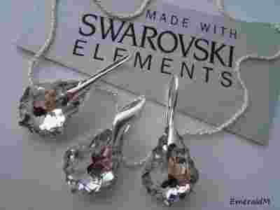 Kryształy w kolczykach zawieszone są na eleganckich srebrnych biglach angielskich. Natomiast zawieszka osadzona jest na okazałej srebrnej krawatce w kształcie fali. Łańcuszek o oryginalnym i pięknym splocie wykonany jest ze srebra próby 925. Na krawatce i biglach angielskich wybita jest próba 925 i dodatkowo dołączona jest metka jubilerska.