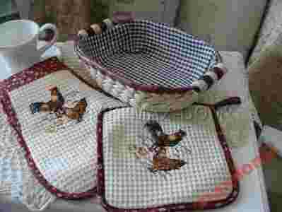 rękawica i podkładka/łapka wypełniona specjalną otuliną izolującą od źródła ciepła . Koszyk wykonany z trawy i wyściełany materiałem w kratkę .