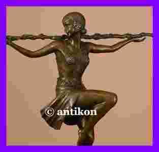 Świetna rzeźba z prawdziwego brązu, przedstawiająca młodą kobietę o niezwykle powabnym ciele. Dziewczyna ukazana została w pełnej gracji tanecznej pozie. Statuetka osadzona jest na profilowanym cokole z brązowego marmuru. Odznacza się precyzją cyzelowania i lekkim patynowaniem. Dbałość o detale a także solidność wykonania wskazują na znaczne walory artystyczne tego urzekającego dzieła rzeźbiarskiego. Przedmiot sygnowany jest nazwiskiem Piere de Faguyse i oznaczony numerem oraz pieczęcią francuskiej wytwórni brązów.