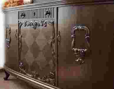 Ślicznie reliefowanej szufladzie towarzyszą wspaniałe, snycerskie dekoracje identyczne jak te, które zdobią boczne skrzydła bufetu.