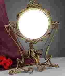 Wykonane wspołcześnie z wysokiej jakości ciężkiego brązu, lekko owalna tafla lustra szlifowana na obrzeżach. Urzeka oryginalność i wykonanie.