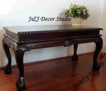 J&J Decor Studio zaprasza na aukcje! Przedmiotem aukcji jest cudowny stolik wykonany w całości z litego drzewa mahoniowego w kolorze ciemnobrązowym (ciemny kasztan delikatnie przechodzący w mahoń).Jest on bardzo solidnie i precyzyjnie wykonany. Jego głównym atutem są przepiękne zdobienia. Szczególną uwagę przyciągają niezwykły nogi stoliczka. Stolik jest nowy.