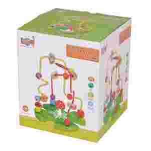 Na dwóch metalowych kolorowych prętach (czerwony i żółty) znajdują się drewniane koraliki, którymi dziecko może przesuwać w dowolny sposób, ćwicząc przy tym precyzję ruchów palców i dłoni. Na pętlach łącznie znajduje się 15 drewnianych klocków i koralików. Wśród nich znajdziemy przede wszystkim małych mieszkańców ogrodu: pszczółkę, żabkę, ślimaczka, ważkę i motylka.
