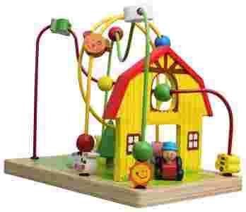 Na trzech metalowych kolorowych prętach (czerwony, zielony, żółty) znajdują się drewniane koraliki, którymi dziecko może przesuwać w dowolny sposób, ćwicząc przy tym precyzję ruchów palców i dłoni. Na pętlach łącznie znajduje się 15 drewnianych klocków i koralików, między innymi: motylki, słonko, świnka, kotek, krówka, chmurka, księżyc.