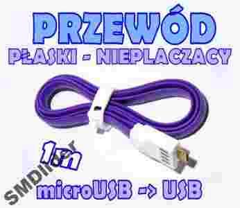 PRZEWÓD KABEL NIEPLĄCZĄCY PŁASKI USB typ A WTYK - micro USB WTYK - około 1 m - płaski wtyk USB