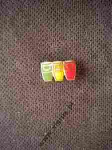 Przypinka jest metalowa, pomalowana na kolory rasta i przedstawia 3 bongosy.