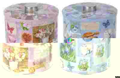 Okrągła blaszana puszka w ciekawe motywy.