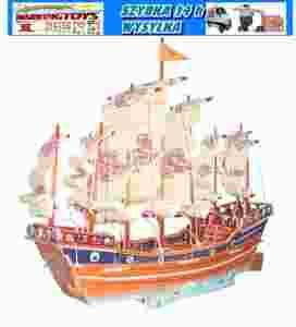 ŻAGLOWIEC- wykonany ze sklejki drewnianej z gotowych powycinanych elementów.Całość pokryta jest kolorowym papierem kredowym który przypomina naturalny wygląd modelu.Pojedyncze elementy układanki wyciskamy z szablonu