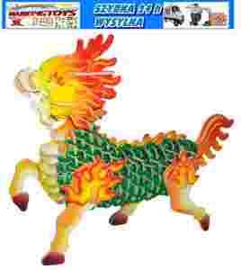 KYLIN- wykonany ze sklejki drewnianej z gotowych powycinanych elementów.Całość pokryta jest kolorowym papierem kredowym który przypomina naturalny wygląd modelu.Pojedyncze elementy układanki wyciskamy z szablonu