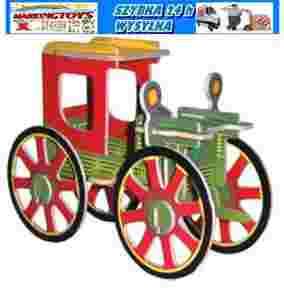 SAMOCHÓD- wykonany ze sklejki drewnianej z gotowych powycinanych elementów.Całość pokryta jest kolorowym papierem kredowym który przypomina naturalny wygląd modelu.Pojedyncze elementy układanki wyciskamy z szablonu