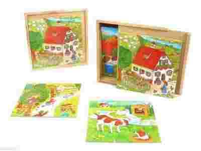 Duże drewniane puzzle - 20 elementów, pozwalają na ułożenie czterech motywów z życia na wsi.