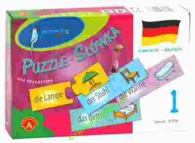 "Puzzle - Słówka" to gra i zabawka dla dzieci, które umieją już czytać i można je zachęcić do nauki języka niemieckiego. Zabawka zawiera 30 dwuczęściowych elementów. Na jednej części znajduje się obrazek, a na drugiej jego niemiecka nazwa. Znajdowanie i łączenie pasujących do siebie par puzzli, umożliwia indywidualną zabawę, w której dziecko może poznać pierwsze niemieckie słowa.