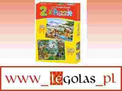 2 x Puzzle /70 i 120 elementów/ - 2 układanki w 1 pudełku !!! Każde pudełko to 2 tematycznie powiązane z sobą układanki o różnym stopniu trudności. Opakowanie zawiera 2 worki z puzzlami, każdy o różnej ilości i wielkości elementów. Worek z większymi klockami to łatwiejsze do ułozenia puzzle 70 elementów, a z mniejszymi to puzzle 120 elementów stanowiące już spore wyzwanie dla dziecka. Wielkość puzzlowych elementów jest zaprezentowana w skali 1:1 na wierzchu pudełka. Seria zawiera sześć produktów. Wymiary po ułożeniu: 40x29 cm