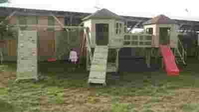 Złożony z: 2 huśtawek pojedynczych, Zjeżdżalni, Drabinki, Domku, Piaskownicy, Ścianki wspinaczkowej, Liny,