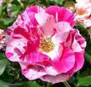 Kwitnienie: Odmiana posiada pierzaste liście, jajowate, błyszczące, ciemno – zielone. Kwiaty ‘Calypso’ pachną, są pół-pełne, ciemno różowe w białe plamki. Kwiaty kwitną od lata do jesieni.