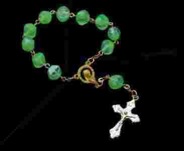Różaniec - dziesiątka, wykonany z paciorków w pastelowym zielonym kolorze.