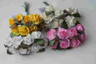 różyczki z papieru z listkiem na druciku.