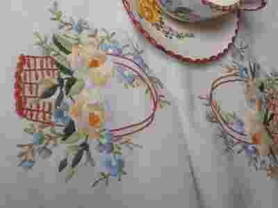 RĘCZNIE HAFTOWANY OBRUS KOSZE Z KWIATAMI