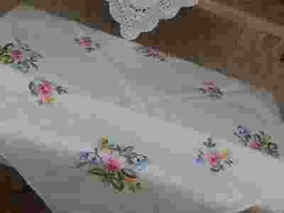 RĘCZNIE HAFTOWANY OBRUS Z MEREŻKĄ