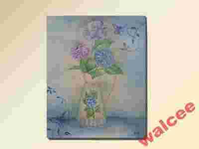 Ręcznie malowany obraz przedstawiający wazon hortensji w pięknych błękitnych barwach.