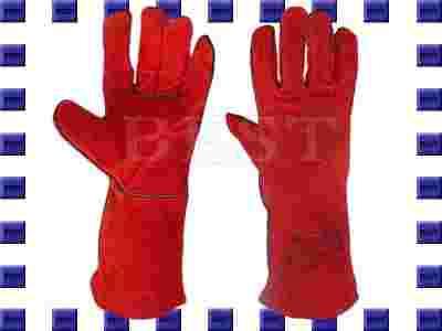 Rękawice spawalnicze wykonane z dwoiny bydlęcej w kolorze czerwonym, szwy zabezpieczone przed przepaleniem, posiadają grubą wkładkę. Długość 35cm.
