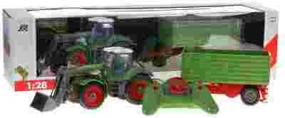 Zdalnie sterowany traktor z przyczepą posiada ergonomicznego pilota, który jest wyposażony w różne funkcje.