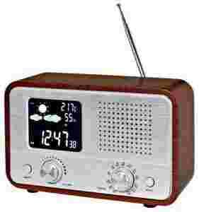 Nostalgiczne radio z aktualną prognozą pogody na wyświetlaczu. Obudowa z prawdziwego drewna.