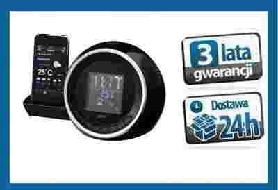 Ogólne informacje: • Funkcja odtwarzania i ładowania iPod/iPhone przez wysuwaną na bok stację dokującą, wraz z przystawką dokującą • Urządzenie wyposażone w 5 nakładek dostosowanych do zazwyczaj spotykanych generacji iPod/ iPhone • Trzy funkce dodatkowe poprzez i Pod Touch/iPhone dzięki możliwości pobrania własnej App (dostępne poprzez App Store) : 1.Informacje o pogodzie 2.Obsługa radia 3. Ustawianie godziny zegarowej/alarmu • Przełączany wyświetlacz (czarno - biały) • Dźwięk stereo • 2-wierszowy wyświetlacz (godzina/budzik, częstotliwość radiowa) • Wejście AUX z kablem przyłączeniowym • 2 stopniowy ściemniacz • Zasilanie awaryjne w razie braku zasilania zasilania sieciowego (baterie w komplecie) iPod/iPhone* Player: • Play/pauza • Utwór do przodu/tyłu Funkcja budzika: • 2 czasy budzenia (3 możliwości włączenia: 1,2 lub 1+2) • Samoczynne wyłączanie ( po 90 minutach) • Możliwość budzenia radiem, iPod lub sygnałem dźwiękowym, powtórne budzenie Godzina: • Wyświetlacz LCD 12/24-godzin, z wyświetlaniem daty Zasilanie prądem: • 230 V/ 50 Hz *iPod/iPhone nie wchodzą w skład kompletu/ bez funkcji ładowania do iPod Shuffle. Instrukcja obsługi w języku polskim Urządzenie nowe, oryginalnie zapakowane
