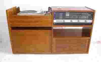 W obudowie szafkowej brakuje stopek i klapy nad adapterem. Dokładny stan szafki jest widoczny na załączonych zdjęciach. W radiu są wszystkie pokrętła, podświetlanie skali działa. Do radioli dołączam jedną zapasową głowice, na której są 2 igły zmieniane zielonym i czerwonym przełącznikiem.