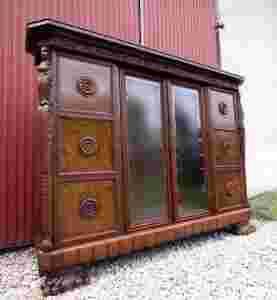 Mebel w swojej rozbudowanej formie nawiązuje do neorenesansu. Widoczna bogata dekoracja snycerska najwyższej klasy - rzeźbienia są ręczne. Mebel wykonany z dębiny, kolor naturalny ciepły dąb.
